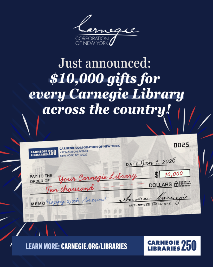 Our library is receiving a special gift! 🎉 We’re one of about 1,280 Carnegie Libraries across the United States that will receive a $10,000 gift from Carnegie Corporation of New York in celebration of America’s 250th anniversary.